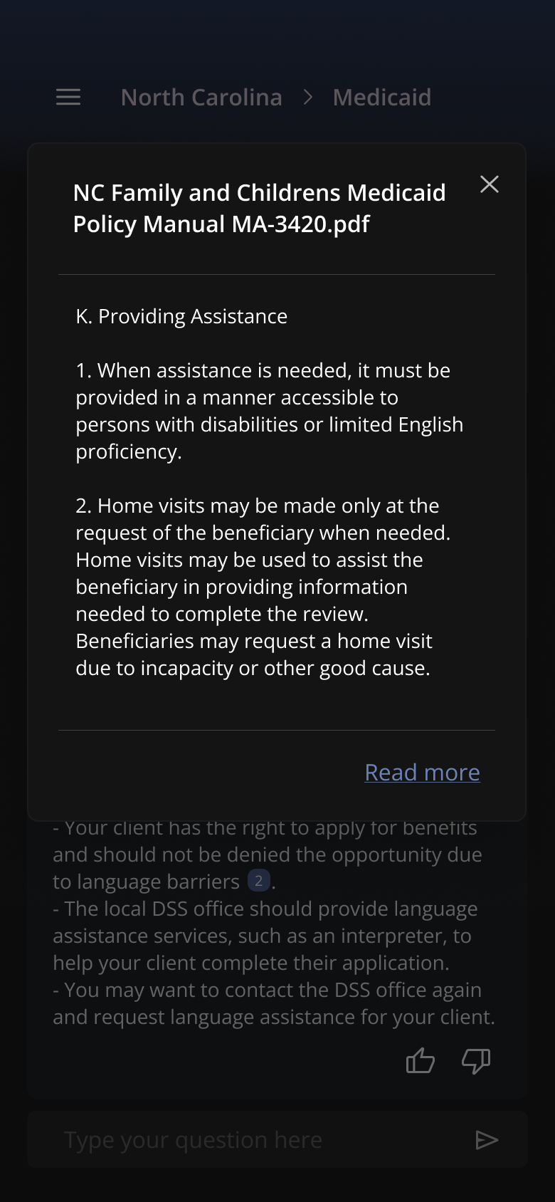 Public benefit navigators spend hours searching policy manuals or calling agencies to confirm eligibility rules. This slows down service and increases the chance of errors which can impact families.